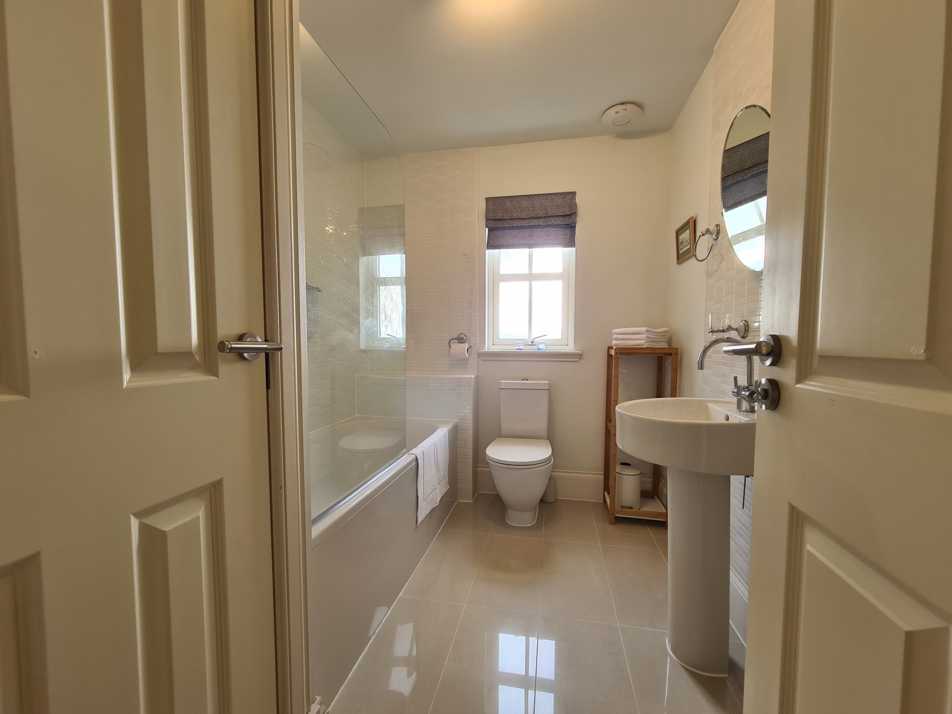 Includes WC, wash hand basin, bath with shower over, and heated towel rail for added comfort.
