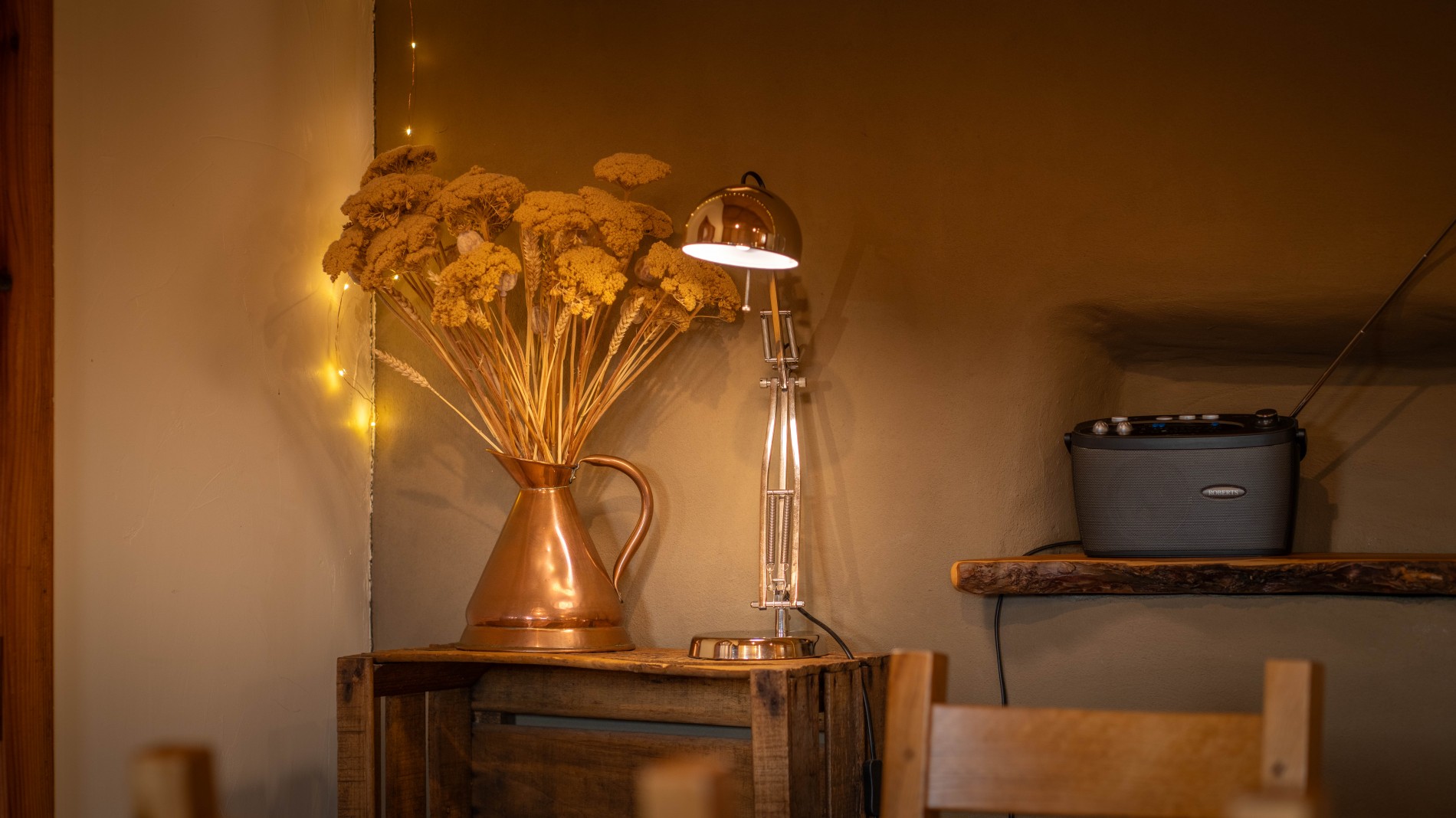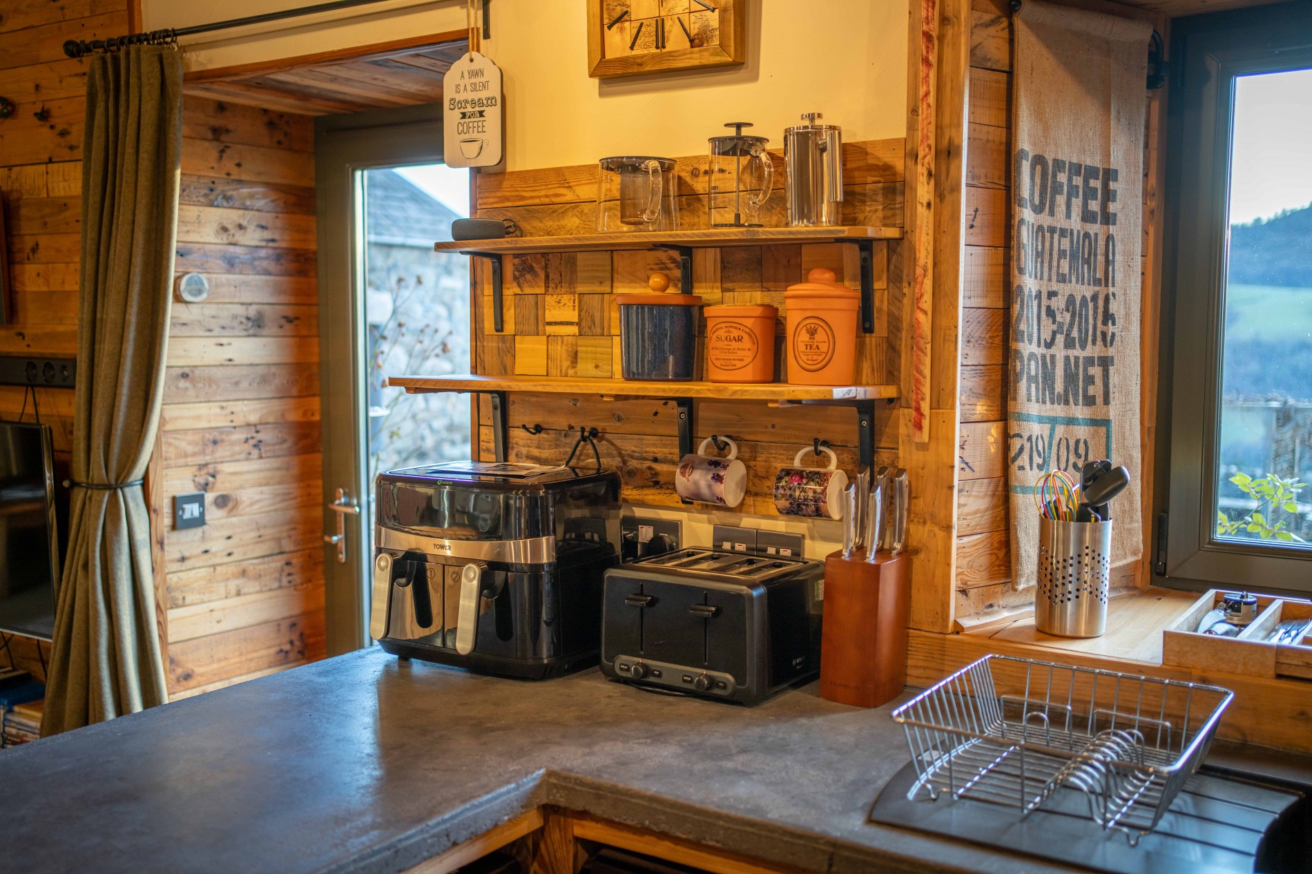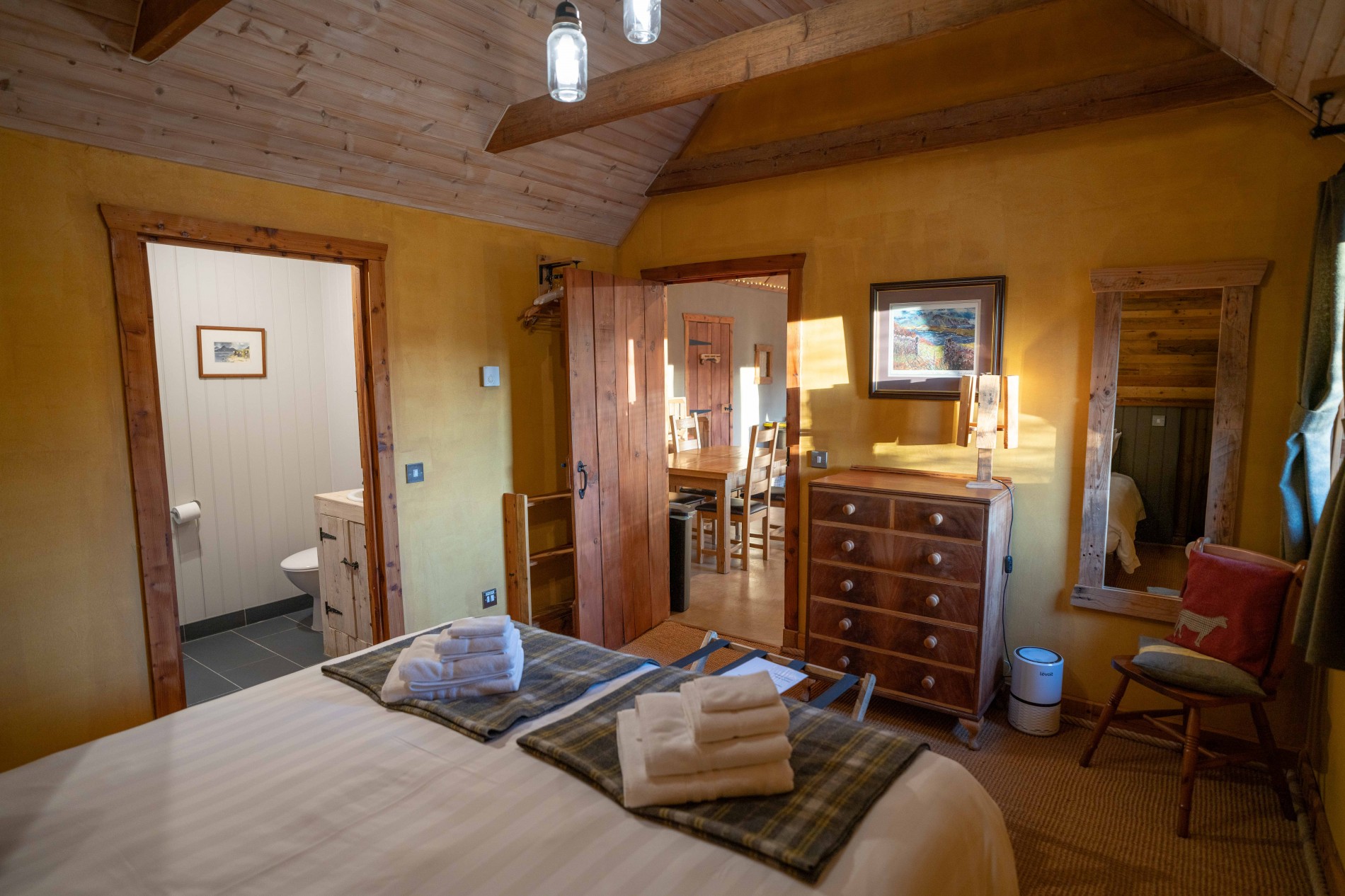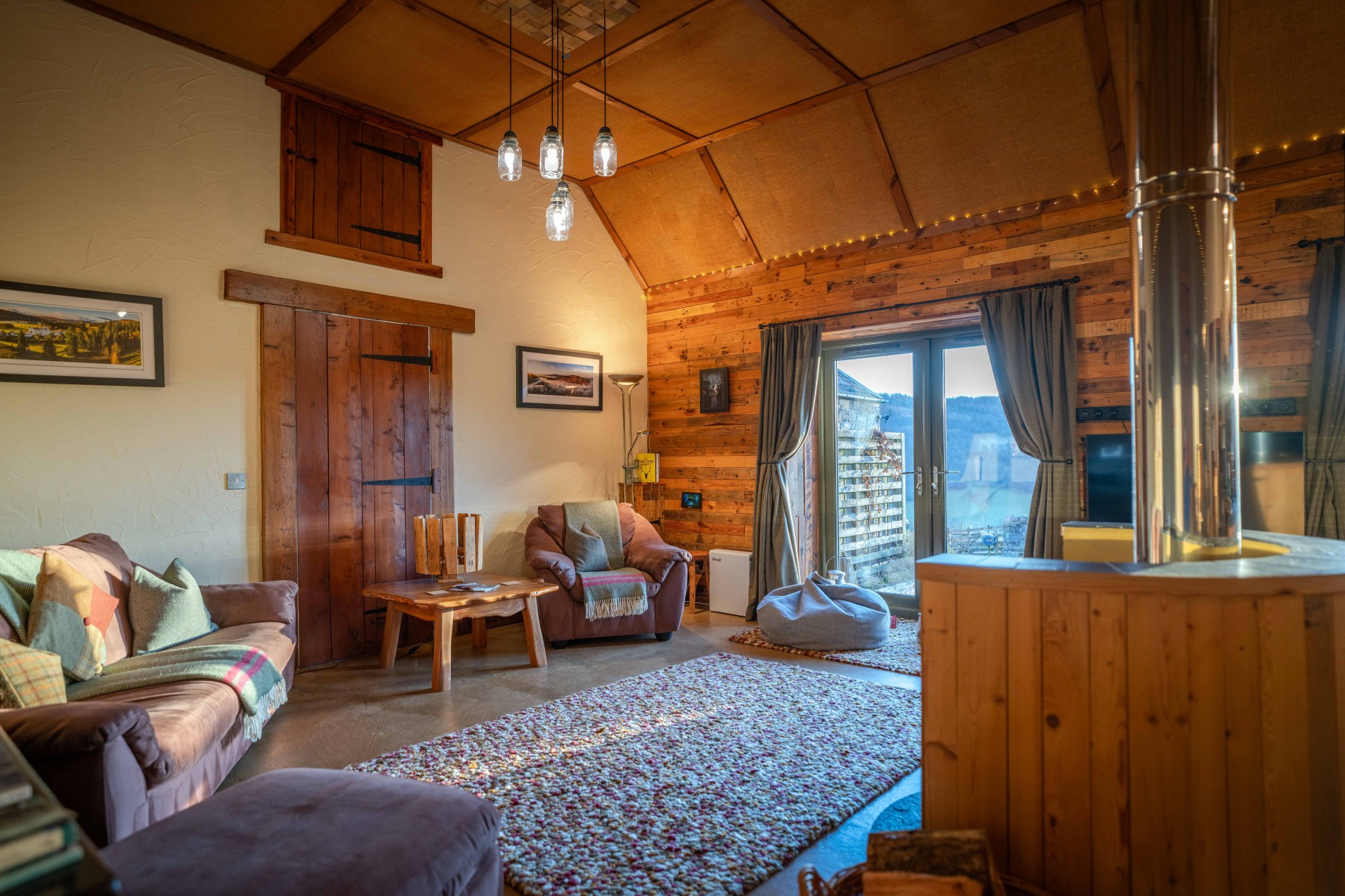 The remaining steading was halved by constructing a straw-bale wall, plastered using traditional clay. This created a generous open-plan living space, something guests at the original Cow Shed always praised as a real highlight of their short breaks and holidays in Perthshire. A centrally located wood-burning stove separates a wonderfully cosy sitting room from the spacious open-plan kitchen dining area.