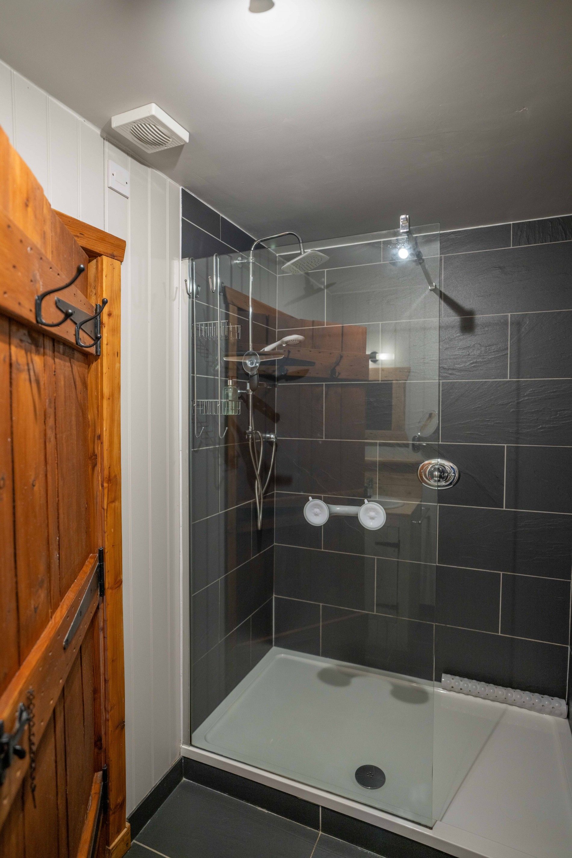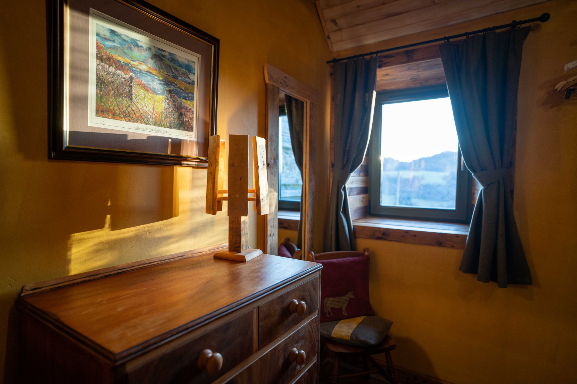 Comfort, sustainability and style are at the heart of Cow Shed 2. The kitchen has been crafted almost entirely from recycled pallet wood – a theme continued with pallet wood-clad feature walls in both the main living area and the adjacent bedroom (bed available as Super King or twin beds – please specify when booking). Underfloor heating runs throughout the cottage, while the wood-burning stove guarantees cosiness in all weathers. The en-suite bathroom features a walk-in power shower.