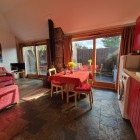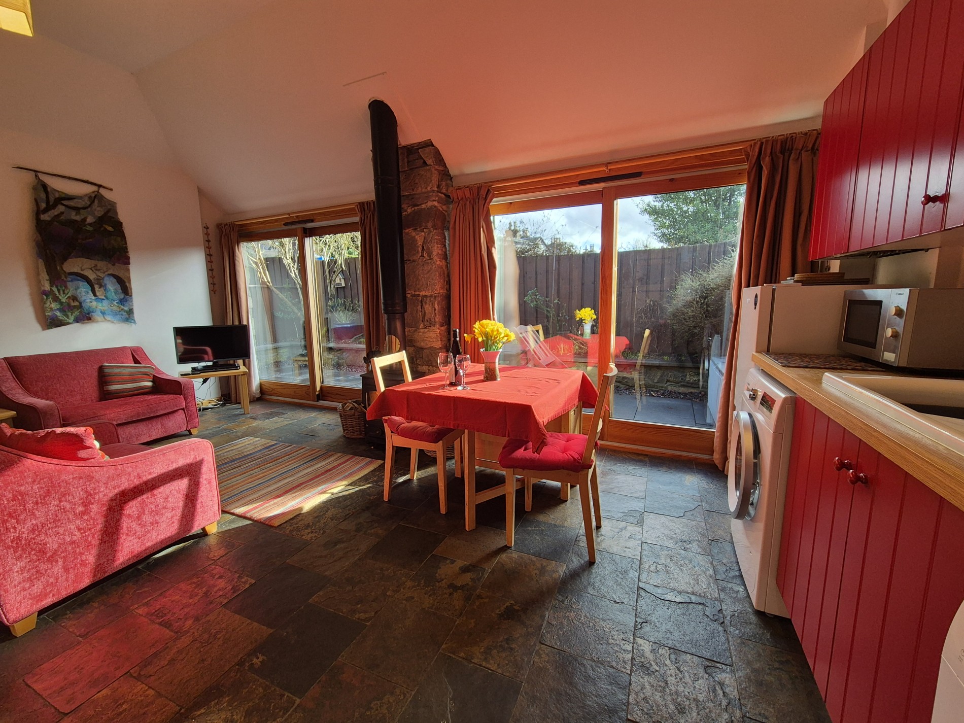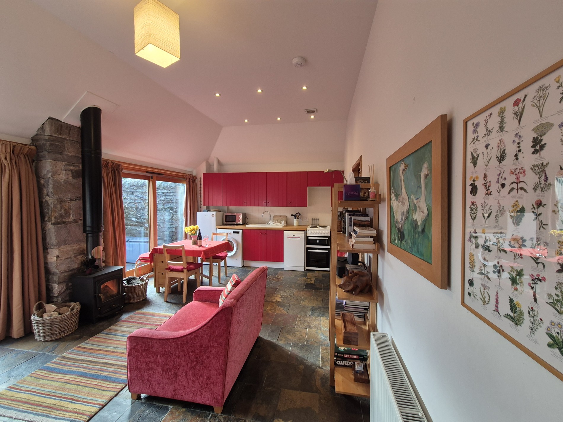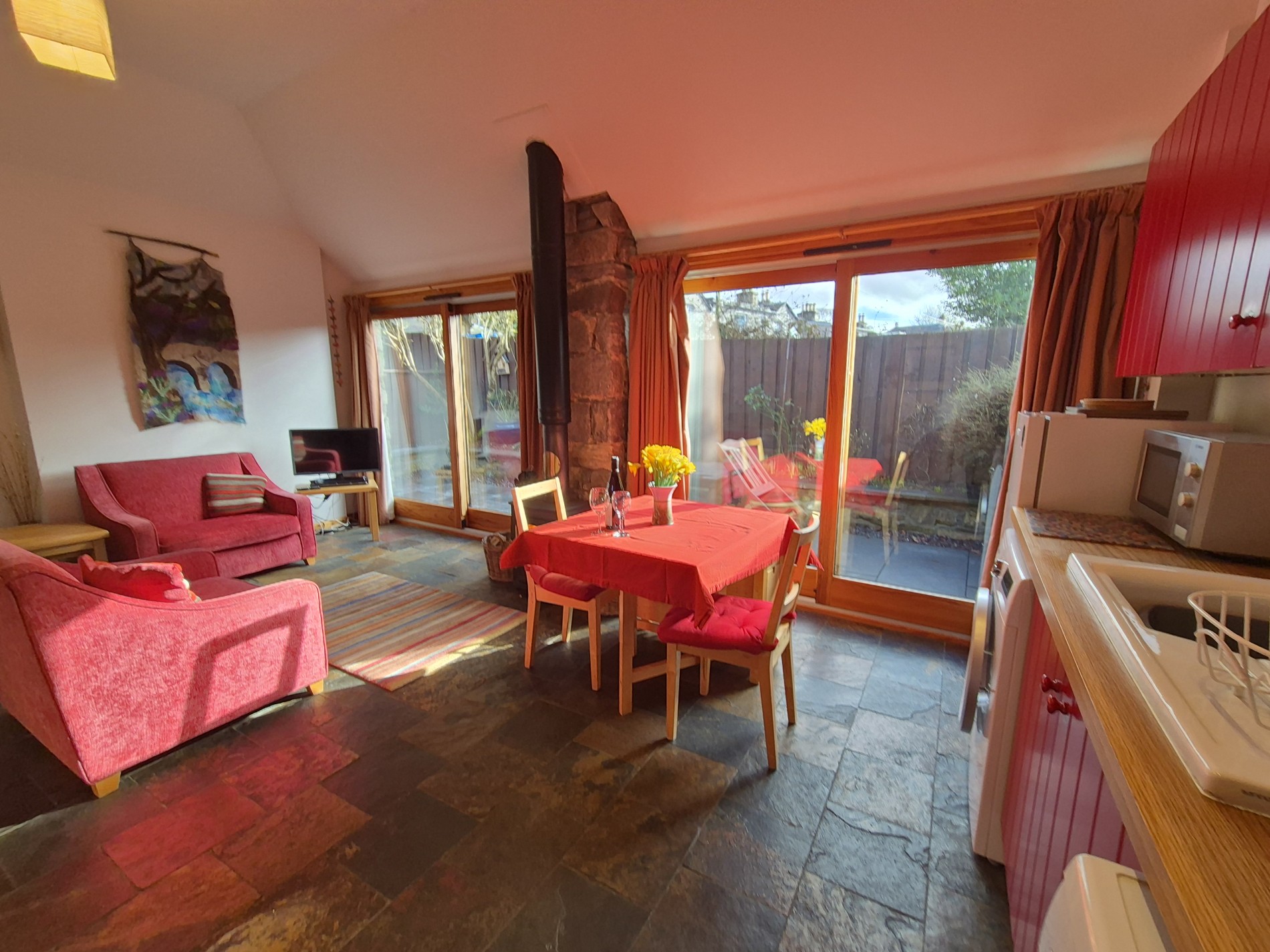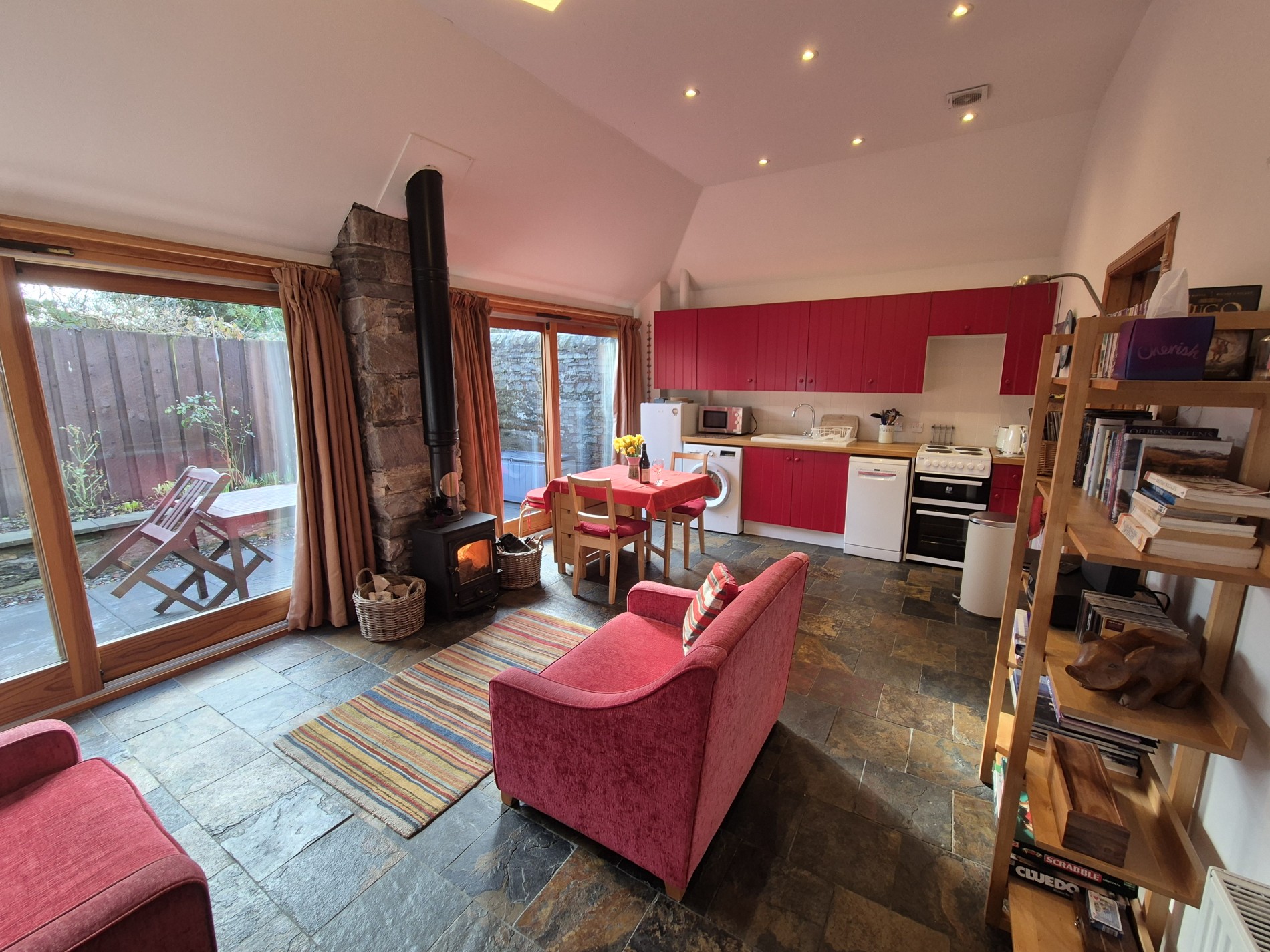 Open-plan living area with wood-burning stove and feature patio doors leading to the garden