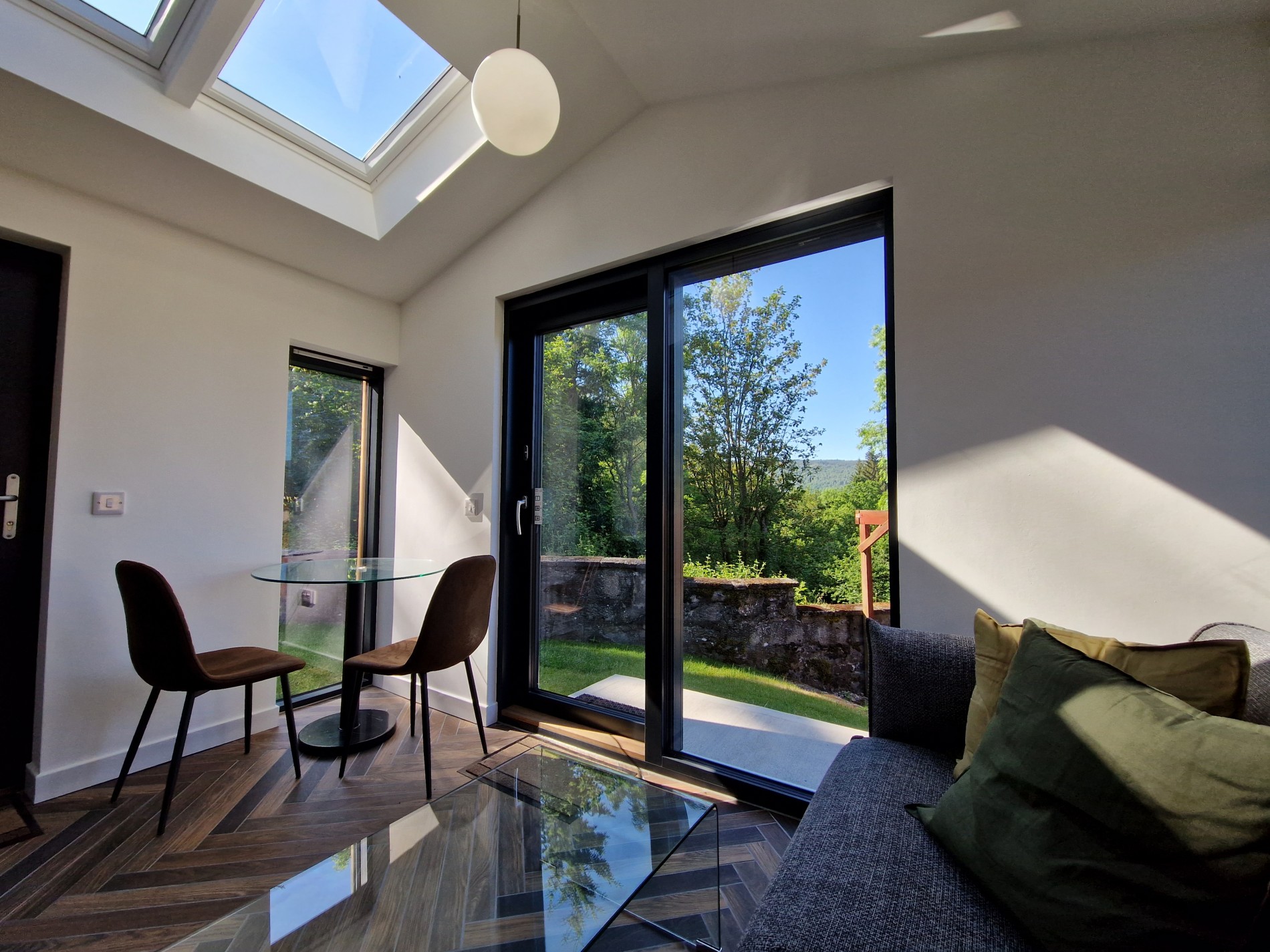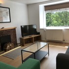A cosy and comfortable space with plenty of seating, large TV, and lovely views over the garden and surrounding woodland—ideal for unwinding after a day of exploring.