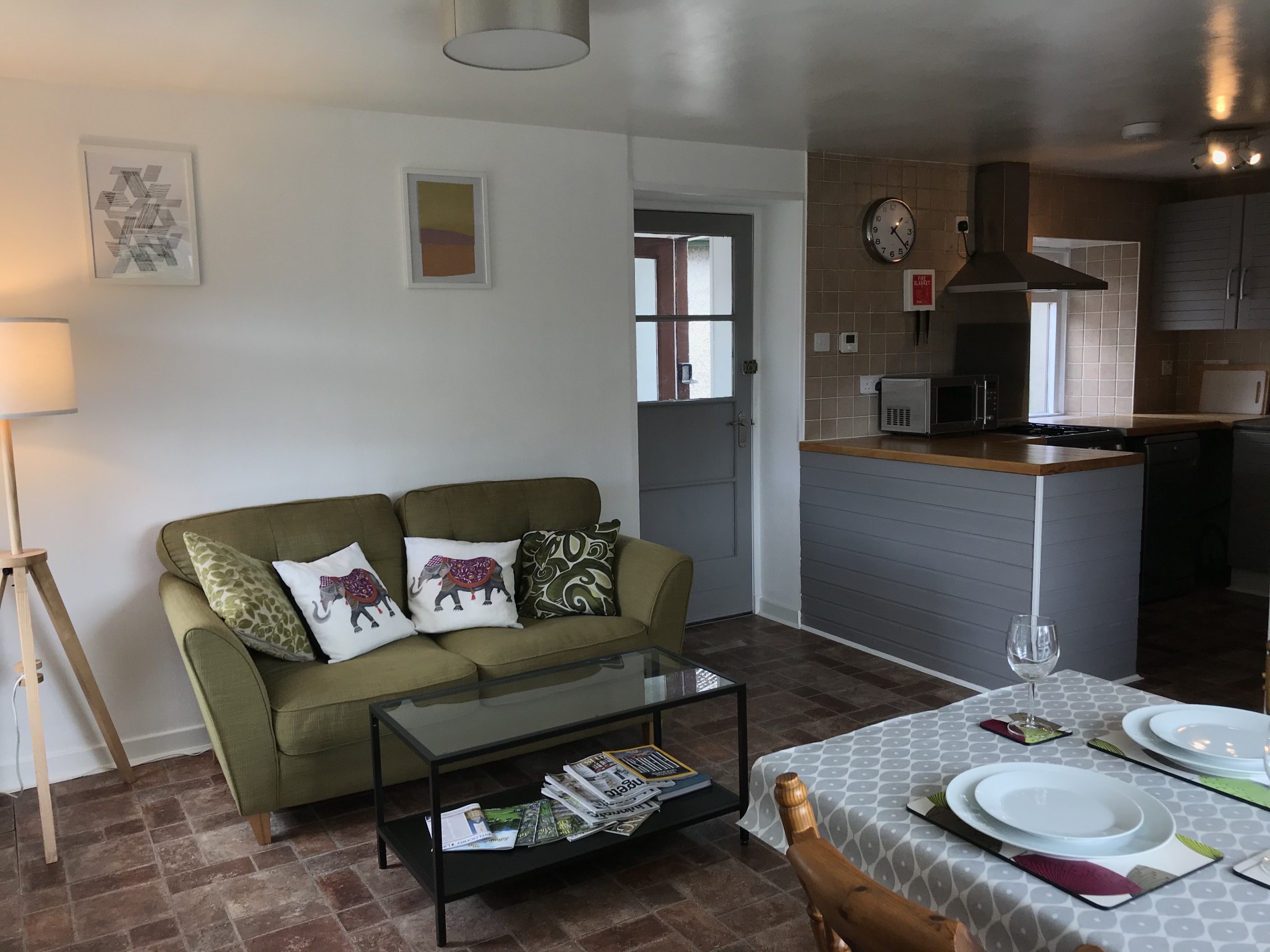 Enter via the rear porch into a bright and inviting open-plan kitchen and dining space. Pleasantly furnished and well-equipped with oven, hob, microwave, fridge with freezer section, and washing machine—everything you need for a relaxed self-catering stay.
