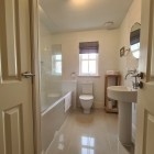 Includes WC, wash hand basin, bath with shower over, and heated towel rail for added comfort.