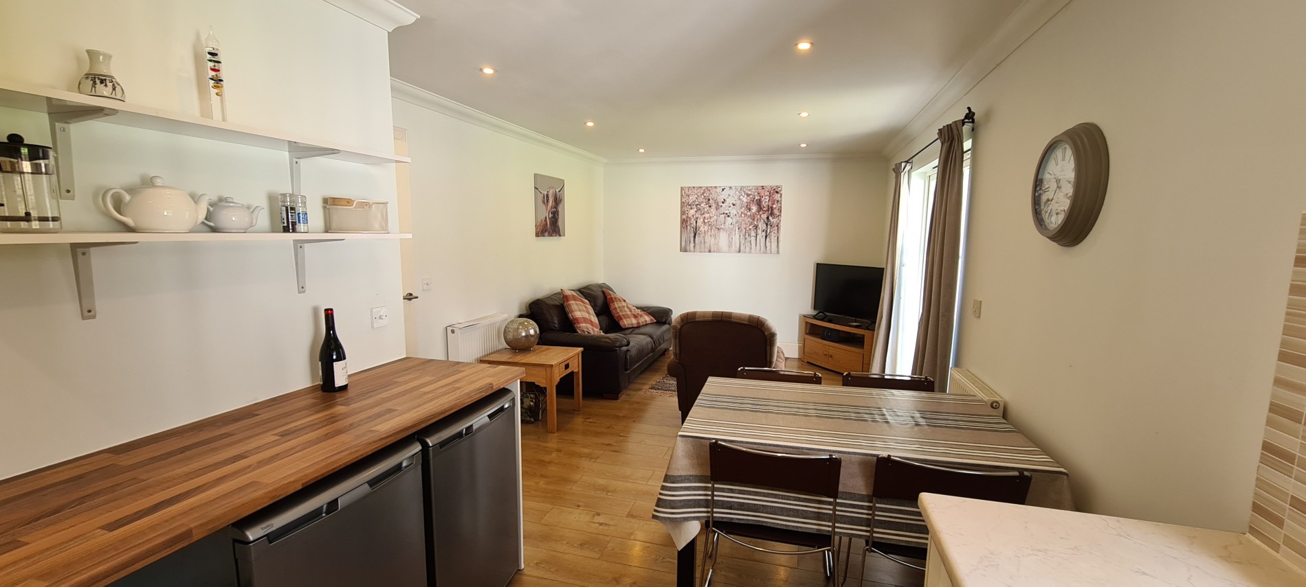 A spacious and light-filled layout featuring a comfortable lounge area, a dining table for formal meals, and a well-equipped kitchen. This sociable space is ideal for relaxing or entertaining. Patio doors open directly to the private rear garden—perfect for enjoying a morning coffee or evening glass of wine.