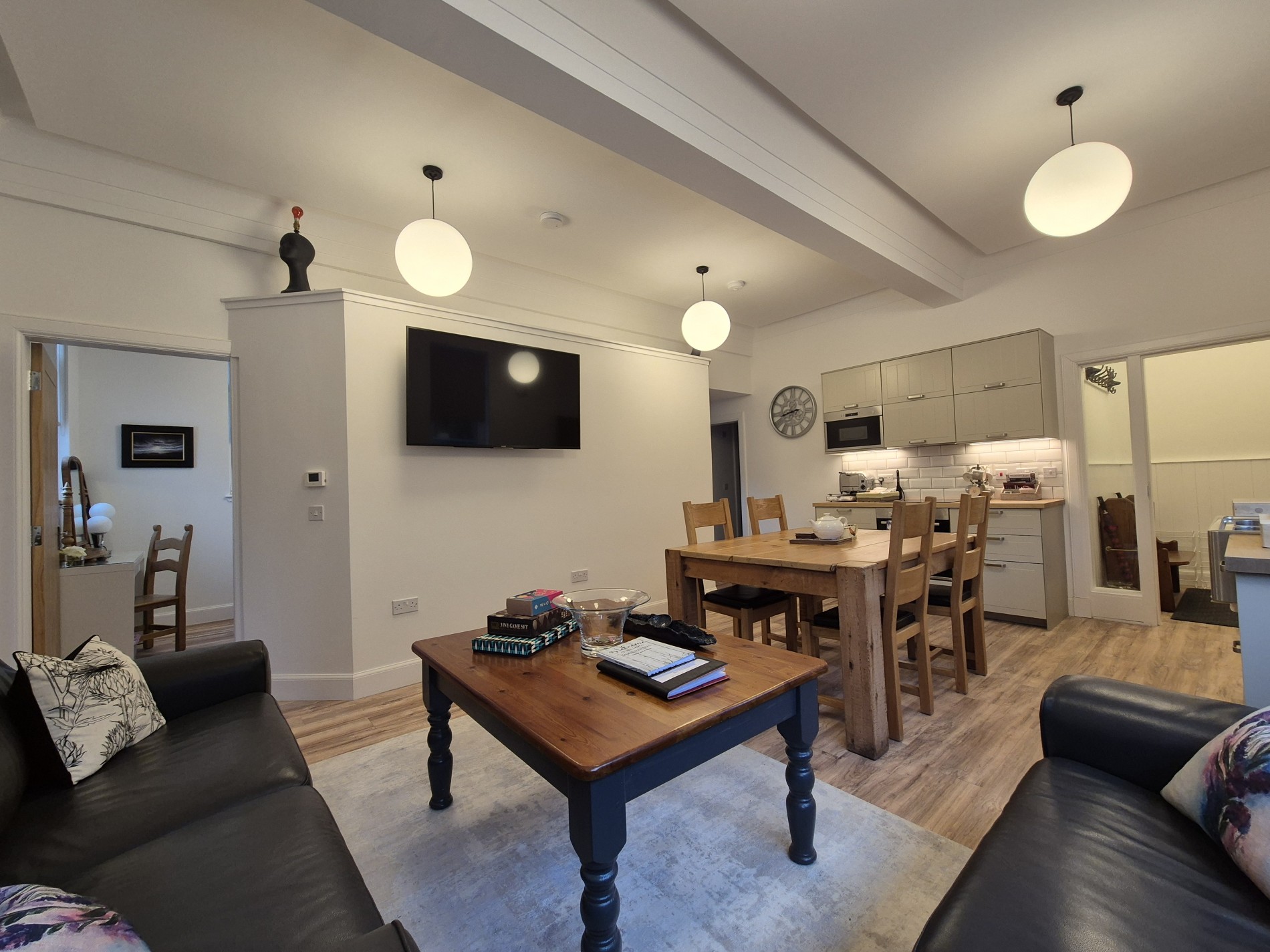 Thoughtfully designed with a bespoke kitchen including oven, hob, microwave, dishwasher, and fridge. The space also features a dining area and a comfortable seating area for relaxing after a day’s exploring.